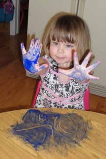 Fingerpaints were used to create our world. We fingerpainted blue for the water and stamped green handprints for the land.