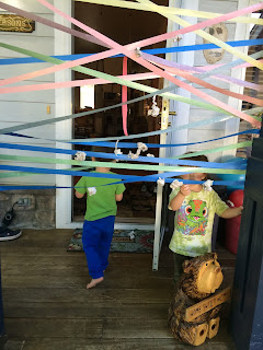 To illustrate how a spider's web is sticky so as to catch its prey, we had sticky tape strewn backwards between two posts. We tore pieces of paper to use as a spider's prey. We threw the paper at the web to see if it would catch in the web. It took some experimenting...some successes and some failures, but we finally got the balled up paper to land in the web as we threw it.
