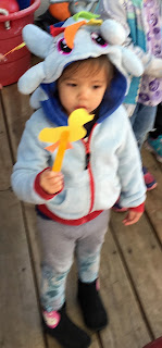 We read about five little ducks and their mommy. They went out to play and when their mommy called them back, they didn't all come. They had to watch out for the fox, but in the end, they all wandered back.