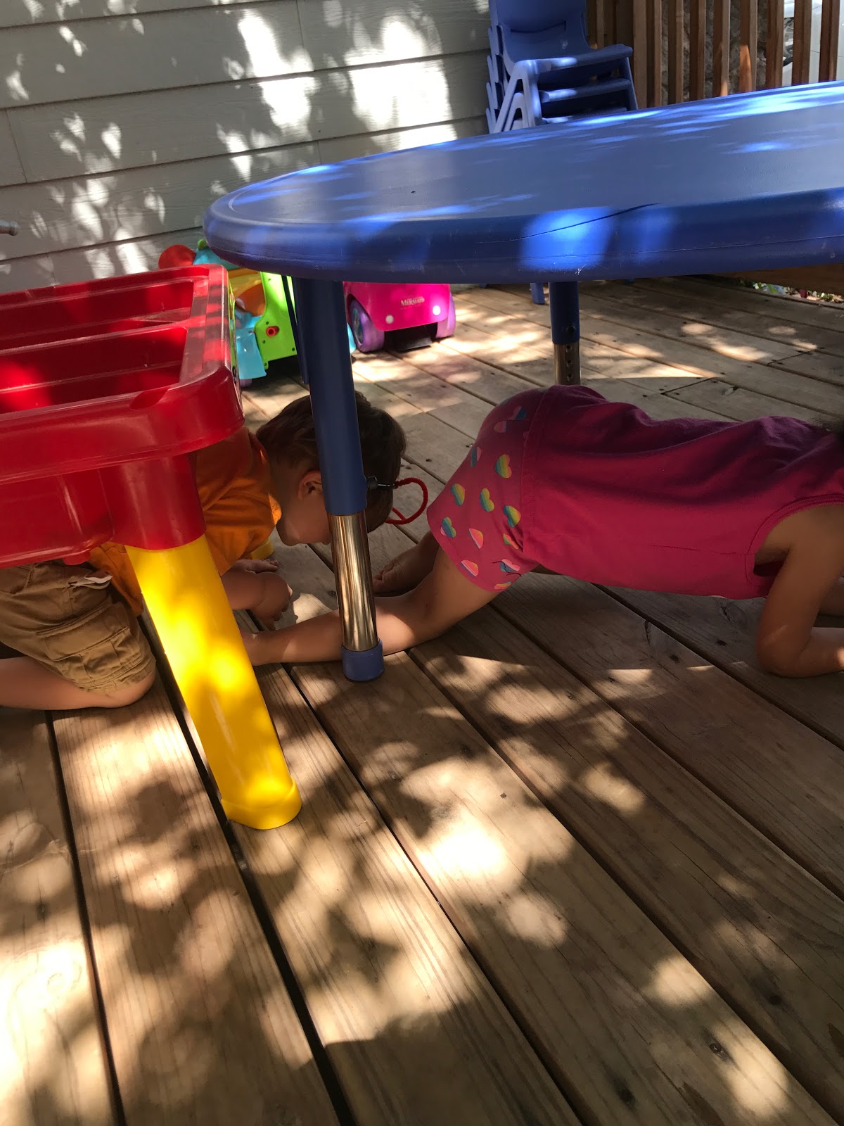One of our sensory bins was filled with sand. We built ant hills and tunnels as if the ants had built them and placed, pretend ants, eggs (beans) and larva (pipe cleaners) among them for some pretend play.